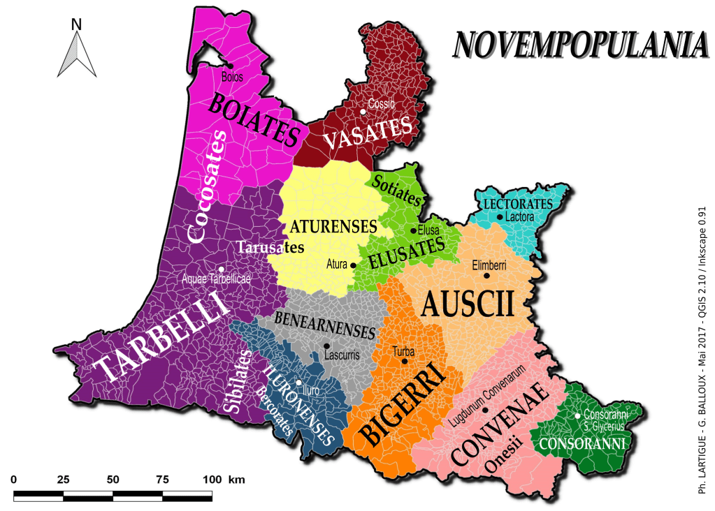 Ces peuples : Ausques (Auch) Aturins (Aire), Tarbelles (Dax), Elusates (Eauze), Lectorates (Lectoure), Consoranis (Couseran), Beneharnis et Illuronnenses (Béarn/Oloron), Biguerres (Bigorre), Convennes (Comminges) s’allièrent aussi à des peuples Celtes Boïates (Pays de Buch/Born) et Vasates (Bazas) . Les noms ont tous été »latinisés » ce qui fait que l’on trouve des orthographes très différentes pour un même peuple.