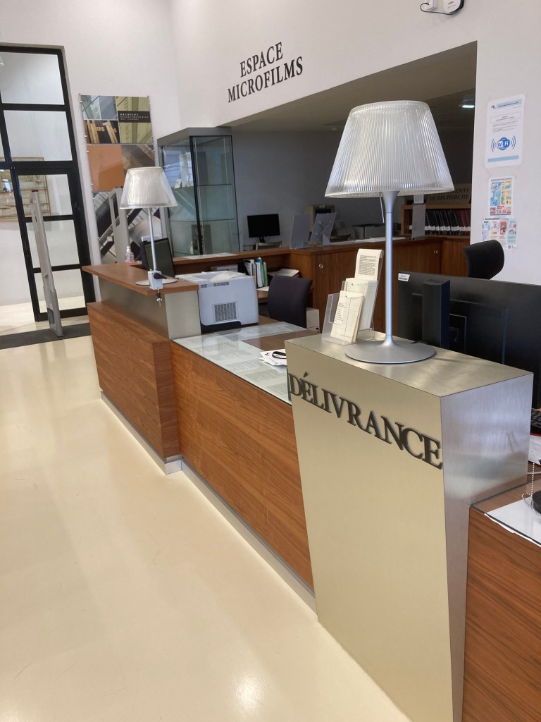 Mes références notées, les règles et astuces lues, j’entre enfin aux AD. Avec l’accueil efficace et chaleureux, me voilà muni de ma carte de lecteur. Il me reste à déposer mes affaires dans un casier et mon manteau dans le vestiaire, ainsi, la salle de lecture m’est accessible. Il faut en effet se débarrasser de beaucoup de choses, pour protéger les documents consultés. Le lecteur a tout de même le droit à des feuilles, un crayon à papier, un ordinateur portable, un appareil photo et à un téléphone. Le principal étant que lorsqu’on prend une photo, il ne doit pas y avoir de flash !
