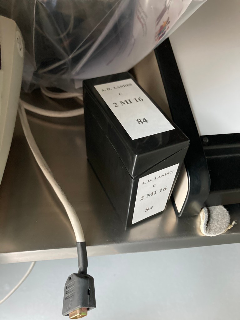 Comme j’habite loin des Landes et que j’ai trouvé des petits trésors sur bobines, je me suis lancé dans ce prêt inter-archives voici quelques mois, bien accompagné par des échanges de mails avec les AD. Résultat, jeudi 6 juin 2024, j’ai pu consulter un microfilm venant des Landes depuis les AD d’Ille-et-Vilaine !
