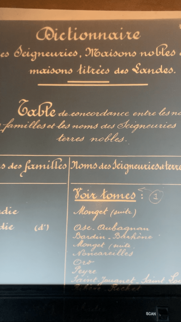 En me lançant dans ce projet, je me posais la question du nombre de vues (pages) comprises dans une bobine classique (30m de long le plus souvent). Le nombre d’environ 600 ressortait mais cela varie. Pour ma part, je n’ai pas vraiment compté mais sur la première machine (j’y reviendrai dans la partie « bricolage ») j’ai cru voir dans les 550 pages. Dans ce « Dictionnaire », les travaux de Vincent Foix sont répertoriés dans un grand tableau, à gauche, les noms classés alphabétiquement et à droite les seigneuries et terres nobles possédées par ces familles landaises. J’ai pris quelques photos mais globalement, j’ai tenté de filmer l’ensemble du document en faisant dérouler lentement le rouleau.