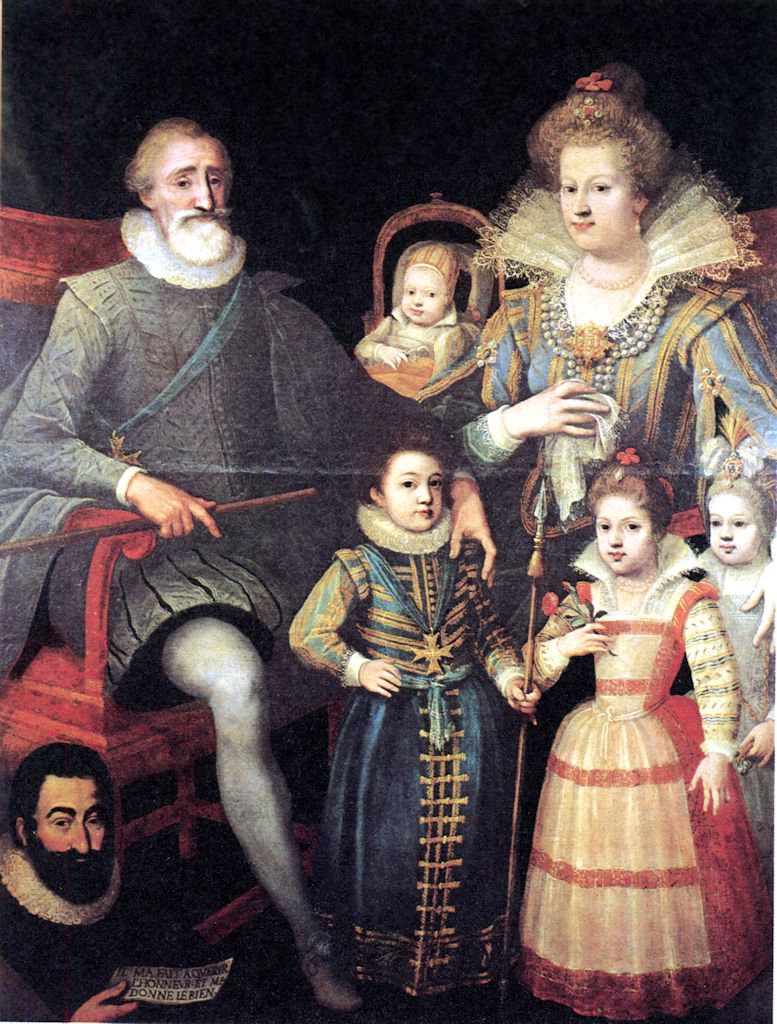 Peinture de 1607 : Louis XIII, entouré de sa famille, dont son père Henri IV et sa mère Marie de Médicis (source image)