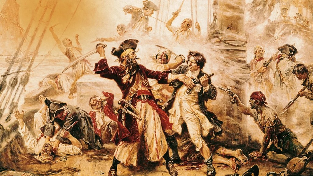 « Barbe Noire lors de sa dernière bataille contre les troupes de Robert Maynard », peinture de 1718 : voir source pour plus d’informations