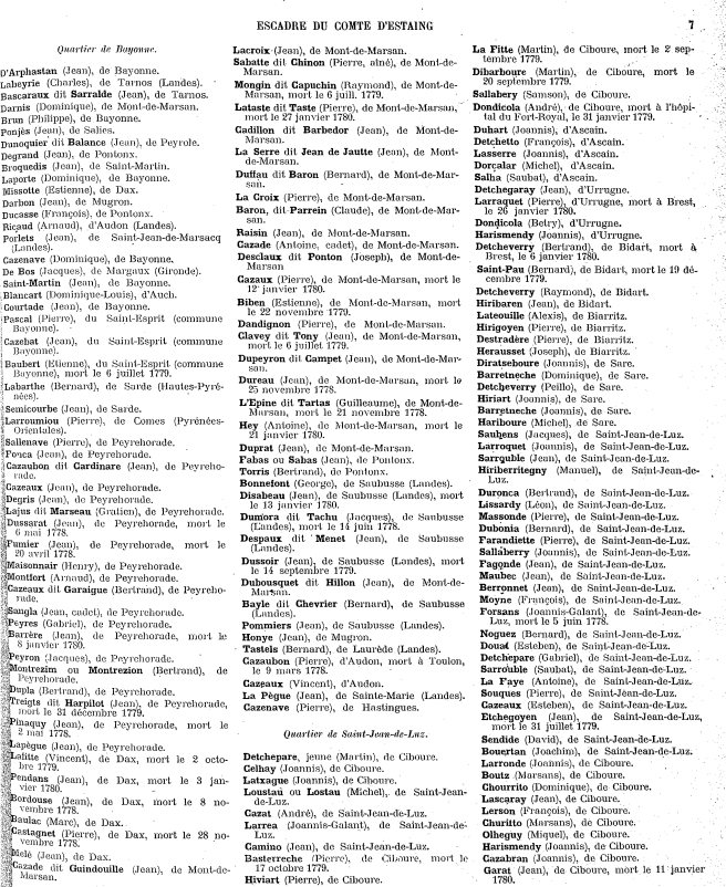 - Lépine Guillaume, de Tartas, mort le 20 nov. 1778 (Nouvelle-Angleterre) [ Warrington Dawson]. Il semble bien que cela soit le même que L’Epine dit Tartas (Guillaume), de Mont-de-Marsan, mort le 21 novembre 1778 [ Les combattants français]. Est-ce Warrington Dawson qui se trompe sur l’identité et la date de mort de ce marin ou a-t-il corrigé une erreur commise dans Les combattants français, en se basant sur les sources primaires ?