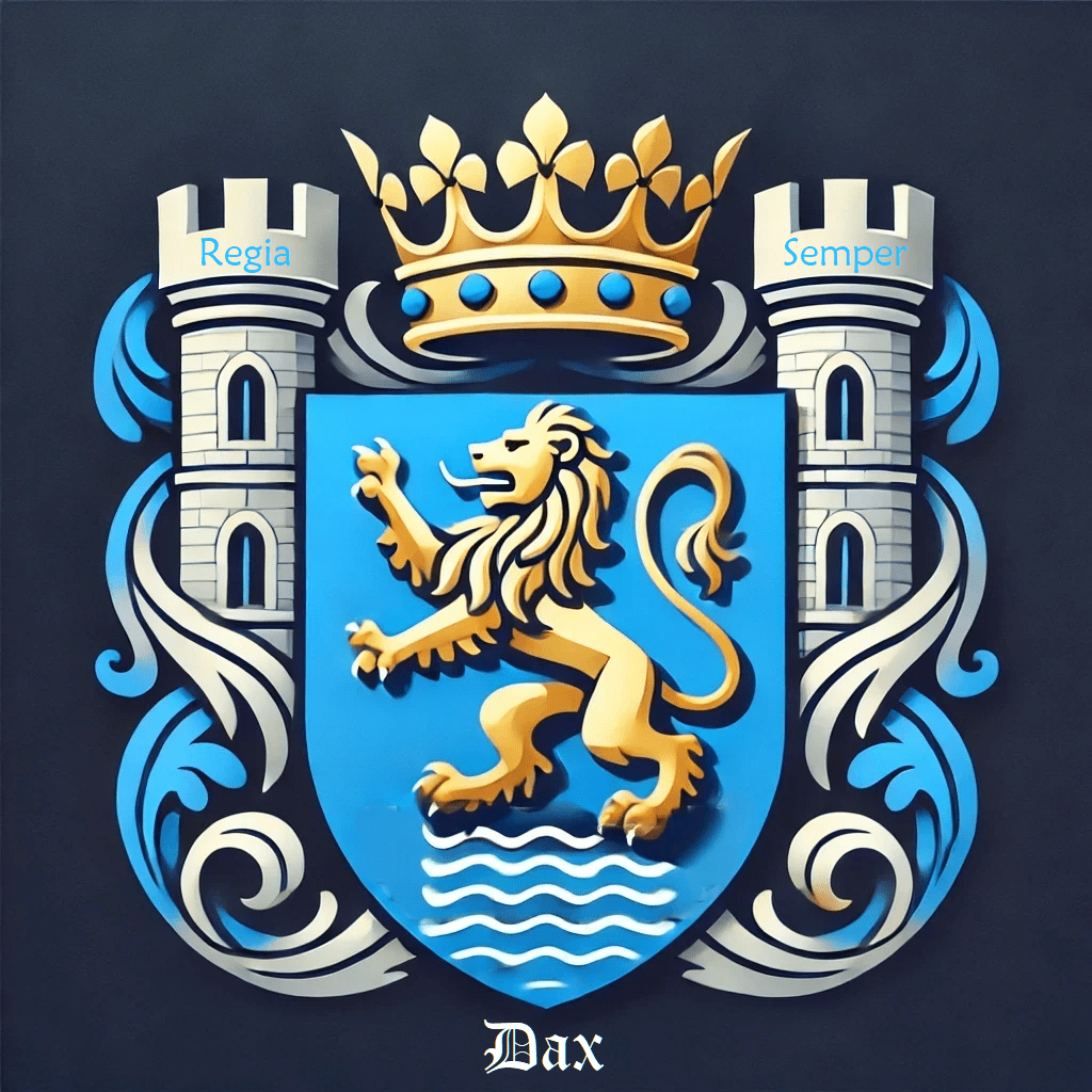 Les blasons des villes symbolisent leur histoire. Le blason de Dax n’y échappe pas et mets en avant les traits saillants de son histoire, de l’époque où il a été créé. Voici le blason dans l’armorial d’Hozier (fin 17ème), cité dans l’article présentant l’héraldique :
