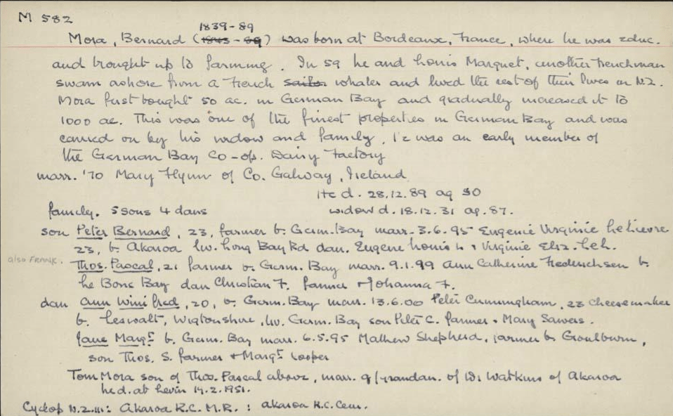 Aujourd’hui, entre les neuf enfants de Bernard Mora et la douzaine de Louis Marquet, il y a sans doute près d’un millier – voire d’avantage – de Néo-Zélandais de nos jours qui comptent ces deux Français parmi leurs ancêtres.
