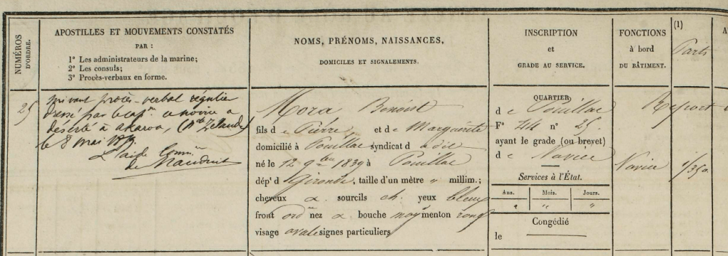 Tout d’abord, on constate qu’il existe effectivement plusieurs dates et et lieux de naissance possibles. J’ai donc vérifié l’ensemble des communes envisageables, et c’est seulement à Mios que l’on trouve l’acte tant recherché ! Mais, me direz-vous, rien ne prouve que cet acte concerne bien notre Bernard Mora… Il faut donc comprendre comment nous en sommes arrivés à cet acte de naissance du 12 novembre 1836 à Mios. Tout remonte, à la trouvaille d’une descendante de Bernard Mora, Bina Cullen (voir son arbre sur wikitree), vue par chat GPT. C’est elle qui finalement nous mène à Mios. Voici l’acte trouvé dans les registres maritimes (permalien direct) :