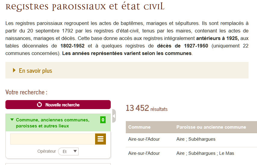 - 2) Les apparentes incohérences de recherches. On observe parfois des bizarreries dans la recherche par ville. Prenons Artassenx, par exemple : la recherche fait apparaître deux lignes distinctes. La première ligne annonce 34 registres, la seconde seulement 1. Et pourtant, il vaut mieux cliquer sur celle qui n’en signale qu’un seul, car elle donne en réalité accès à 35 documents ! Pourquoi ? Parce qu’il existe une recherche pour la commune elle-même et une autre lorsque Artassenx est rattachée à une autre entité (un peu comme une ancienne paroisse par exemple). Donc 34 + 1 = 35 !