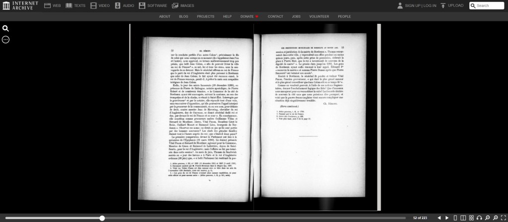 Page 52 : Le jour des saints Innocents (28 décembre 1289), en présence de Pierre de Bafougne, notaire apostolique, de Pierre Robert et de nombreux témoins, la Commune de la cité de ayant été convoquée, suivant la coutume, au son des trompettes et de la cloche, se réunit à Saint-Eloi. Interrogée par le gouverneur et par le notaire, elle répondit tout d’une voix, sans rencontrer d’opposition, qu’elle poursuivra l’appel interjeté par le procureur de la communauté, ou en son nom, pour défaut de droit, contre messire Jean de Havering, chevalier du roi d’Angleterre, duc de Guyenne, se disant sénéchal dudit roi et duc, par-devant le roi de France et sa cour . En conséquence, elle constitua comme procureurs maître Guillaume Vidau et Bernard de Montlaur, clercs, Agitai Pansa, Bonafous Cotet le Roux, Gaillard Mosset et Raimond Léon, bourgeois de Bordeaux…