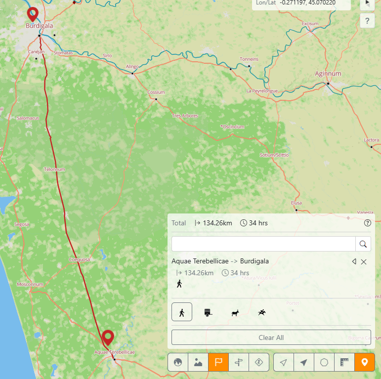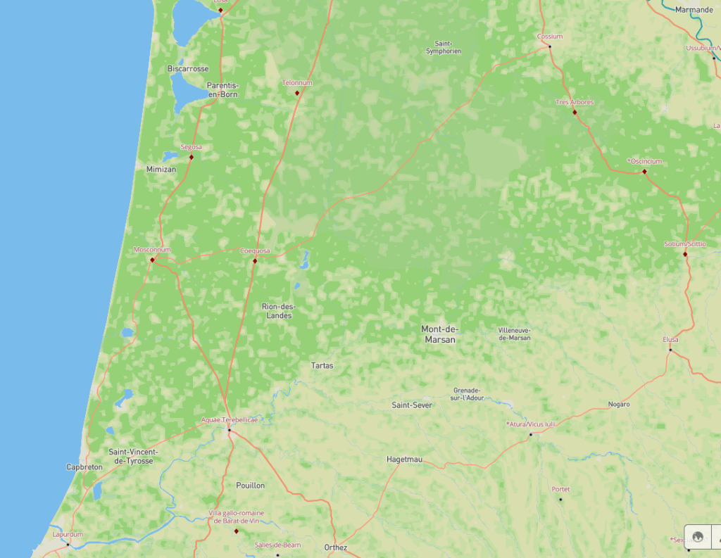 Zoomons sur les Landes actuelles ! Alors bien sûr cela dépasse un peu, mais on va se concentrer sur les villes Landaises qui sont à une intersection de voies romaines. Nous avons Lit-et-Mixe (Mosconnum), Sindères (Coequosa), Labenne (pas de nom romain) et Dax (Aquae Terebellicae) . Je vous laisse trouver vous même les autres villes sur une voie !
