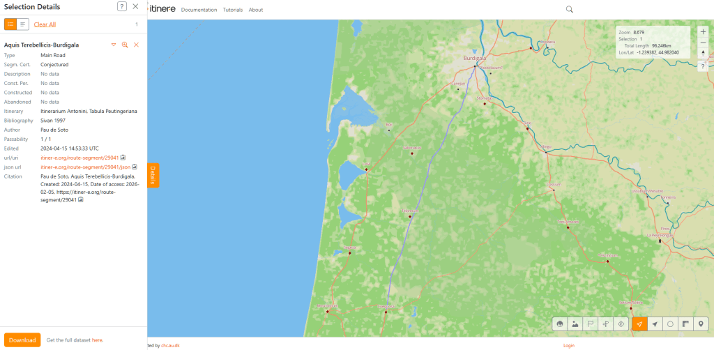 « Itiner-e a pour objectif d’héberger l’ensemble de données numériques ouvertes le plus détaillé sur les routes de tout l’Empire romain. La création des données est un projet collaboratif en cours, édité par une communauté scientifique. Itiner-e vous permet de visualiser, d’interroger et de télécharger des routes. Chaque segment routier dispose d’un identifiant URI qui permet de le citer et de le relier à des ressources externes. Il comprend également un outil de recherche d’itinéraires permettant d’explorer les itinéraires et les temps de trajet dans le monde antique (version bêta). »
