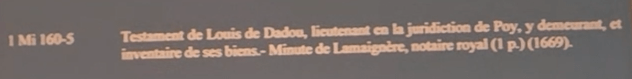 Il se nomme Louis Dadou et est décédé en 1669. Son acte de décès est introuvable dans les registres (en tout cas en ligne), mais grâce au document que je vais vous présenter, on a beaucoup mieux : son testament et l’inventaire de ses biens. Le 26 novembre 1669, Louis Dadou, notaire royal et lieutenant de la juridiction de Poy (aussi écrit Pouy, ancien nom de la ville de Saint-Vincent-de-Paul) rédige son testament et décède quelques jours plus tard, le 5 décembre. Il demande à être inhumé à l’église de cette même paroisse.