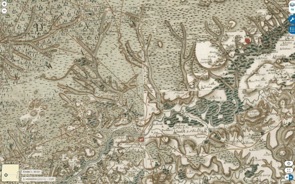 En consultant le source de cette carte ci-dessus, vous verrez qu’un clic sur chaque feuillet donne accès à ses informations détaillées. Prenons l’exemple de Mont-de-Marsan : il correspond au feuillet 106, daté ici de 1786. Cela signifie que tout lieu mentionné sur cette carte est attesté à cette date.
