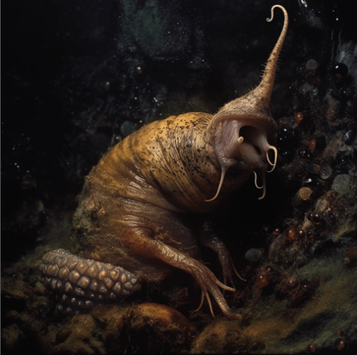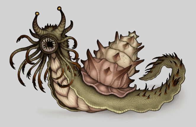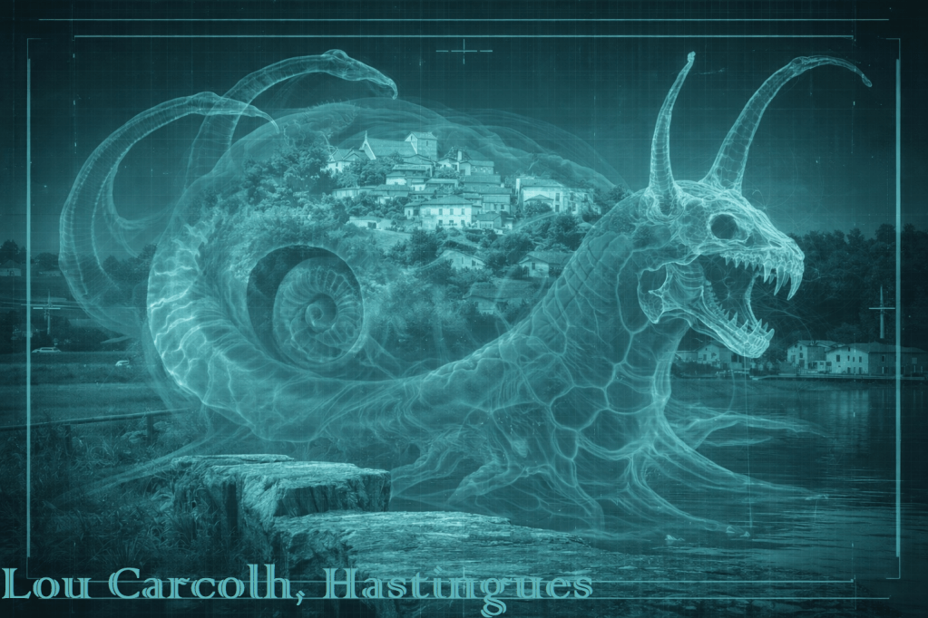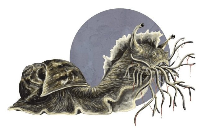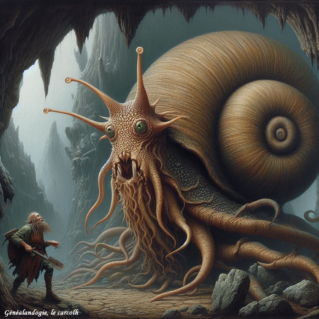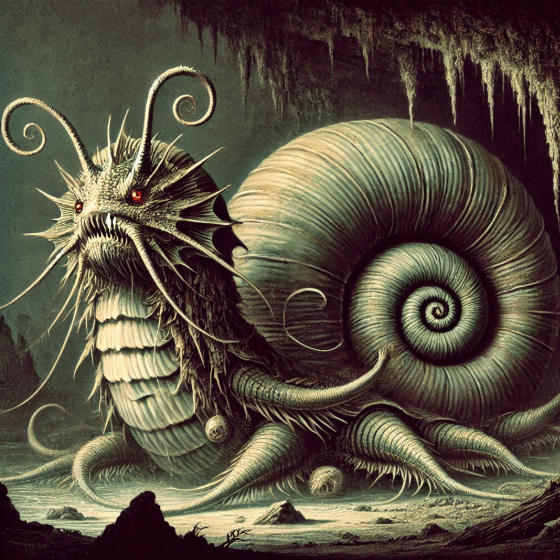 Toujours avec le fil rouge à partir de Sorcières et Loups-garous dans les Landes, de Vincent Foix : « Escargot monstrueux qui a son gîte dans une vaste et sombre caverne au-dessus de laquelle est bâtie, d’après les traditions, la ville de Hastingues. (…) sorte de long serpent visqueux et velu » p.15. On apprend aussi qu’il a d’horribles tentacules.